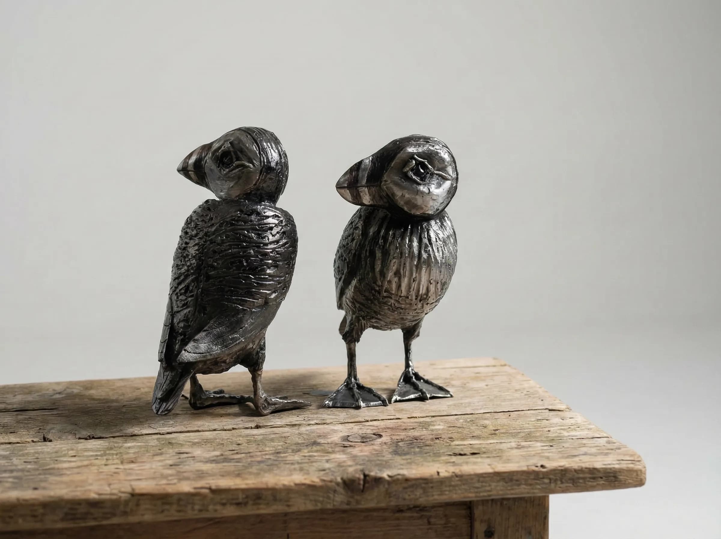 In this life-sized study, I used stainless steel to capture the compact, robust frame of the Atlantic Puffin. The metal is worked to reflect the dense, weather-resistant layering of their feathers, while the bold geometry of their bills is brought into sharp relief. By presenting them as a pair, the sculpture emphasizes the social bonds and shared vigilance essential for life in the harsh Atlantic elements. The reflective nature of the steel suggests the shimmering spray of their coastal habitat, freezing their animated presence in a permanent, tactile form.