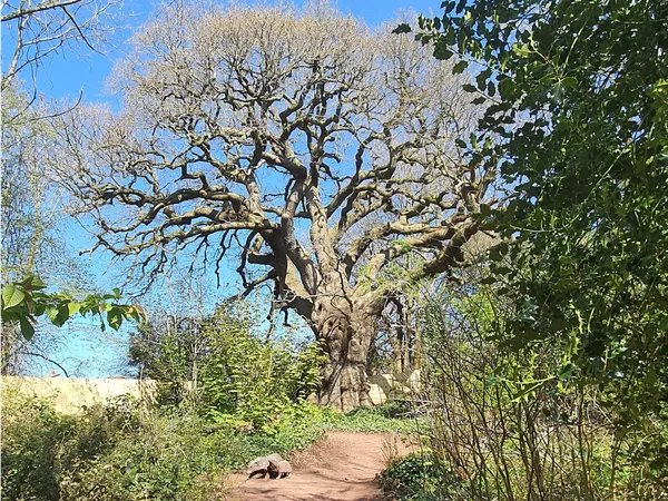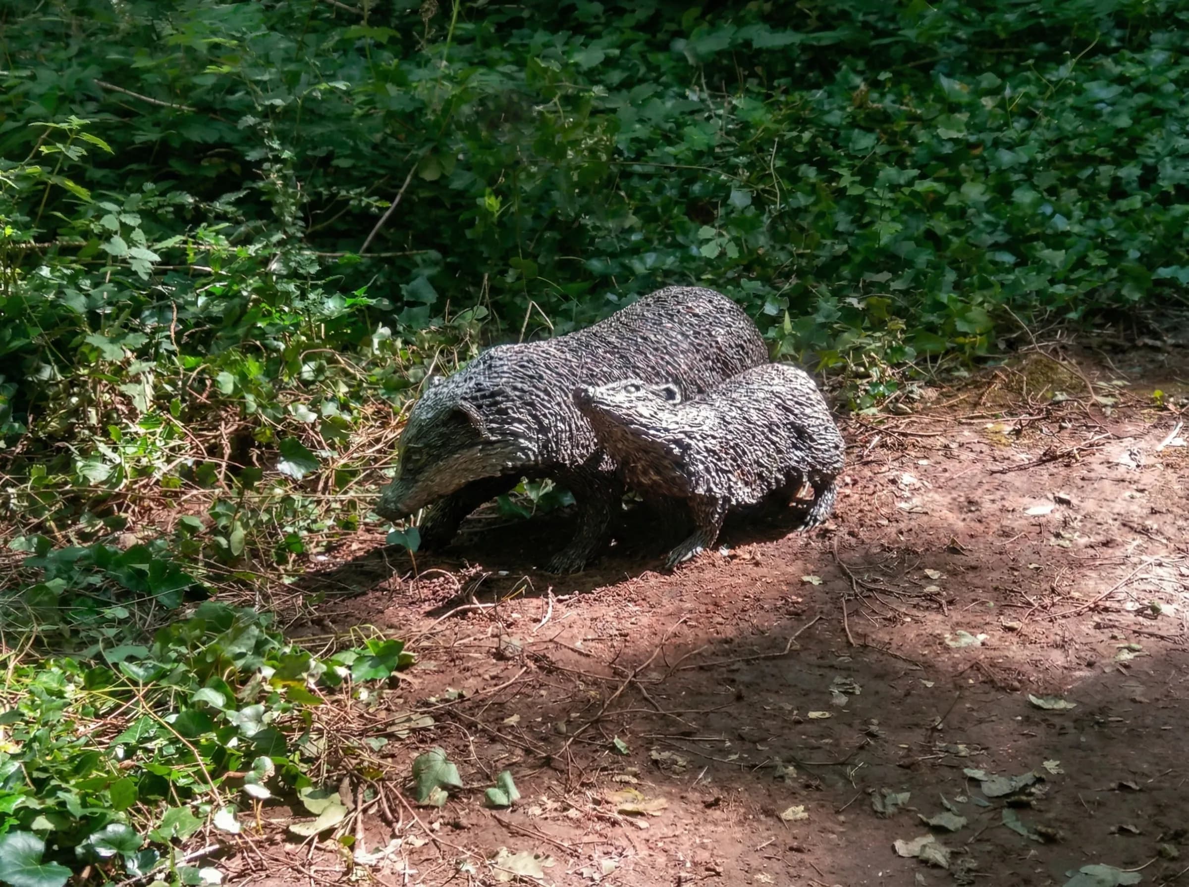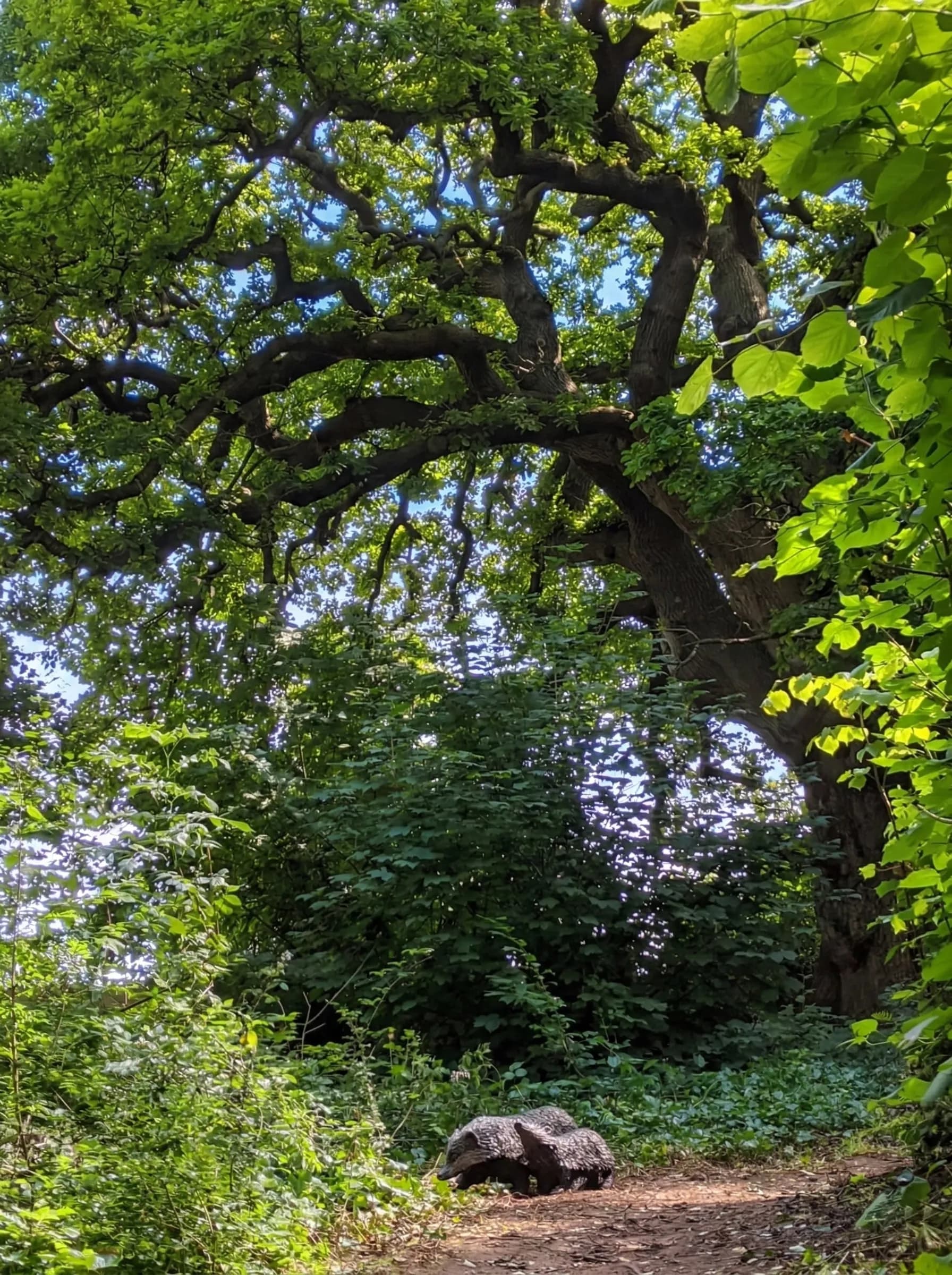 The sculpture captures a tender and natural scene: an adult Badger (Meles meles) foraging alongside its young cub. To ensure the piece harmonises with its wild surroundings, the animals are installed directly at ground level on the woodland floor, emerging from the undergrowth beneath the canopy of ancient trees.