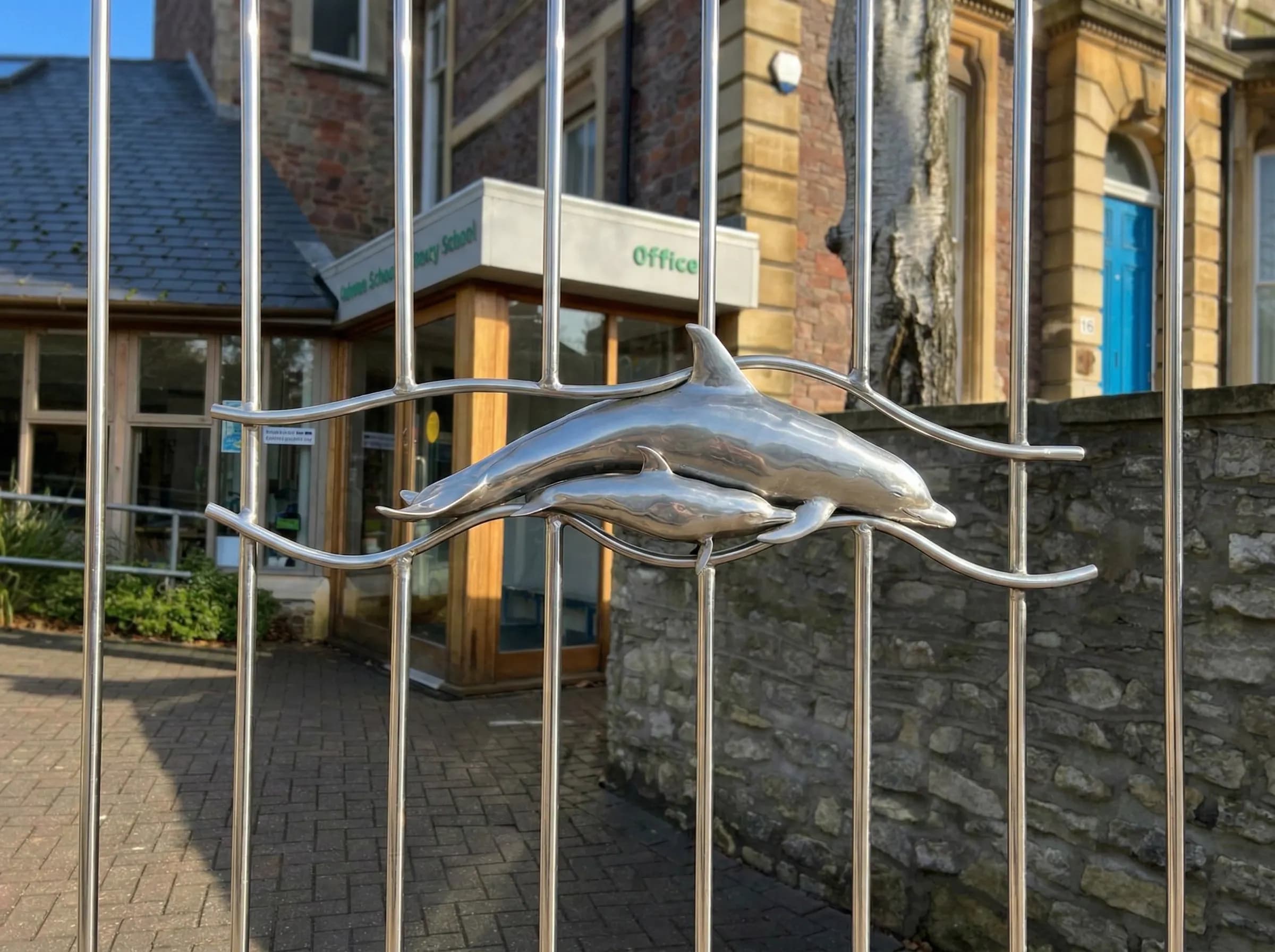 Stainless steel dolphin sculpture commissioned for Cotham Gardens Primary School. The design is seamlessly integrated into the entrance railings.