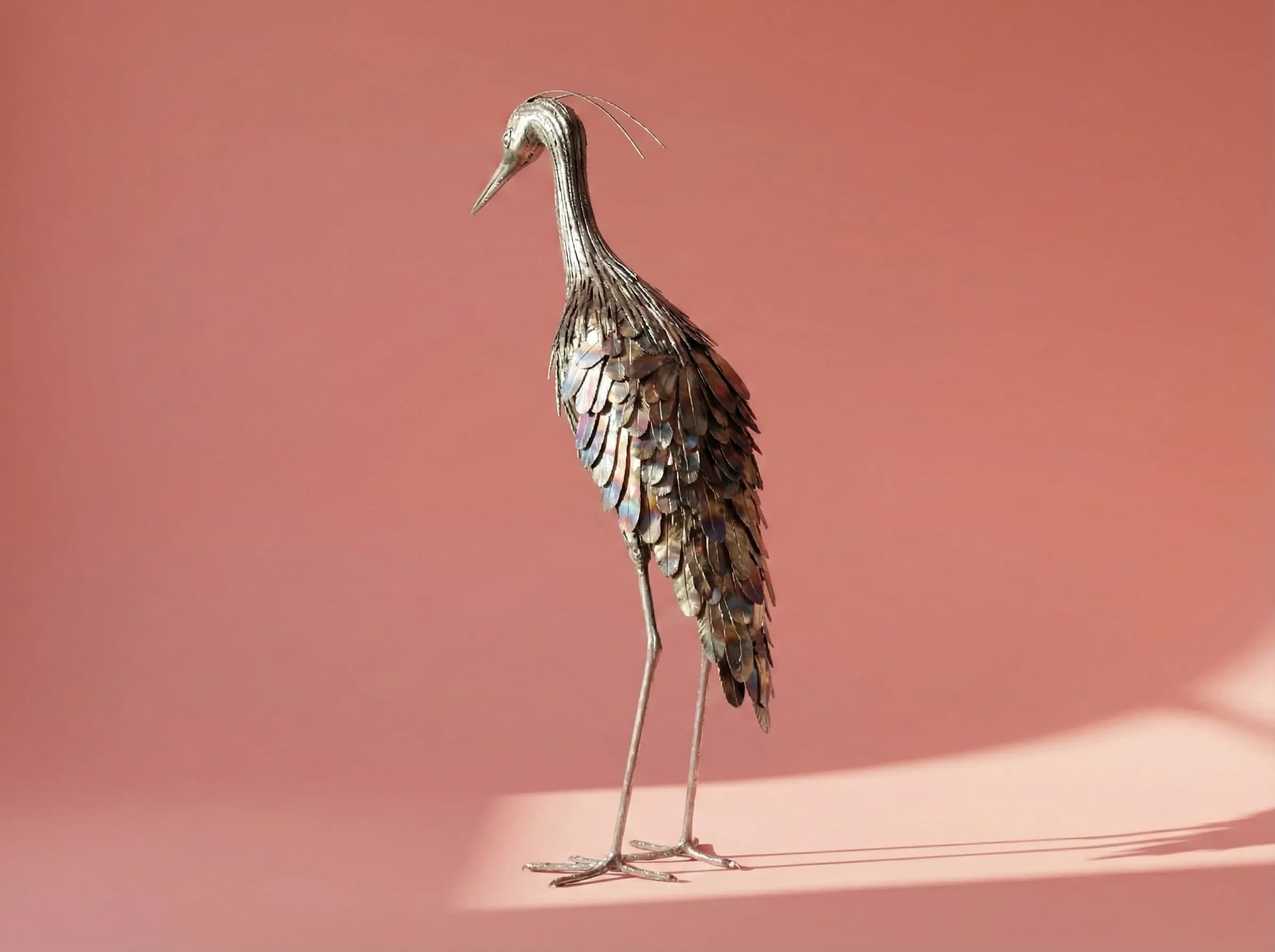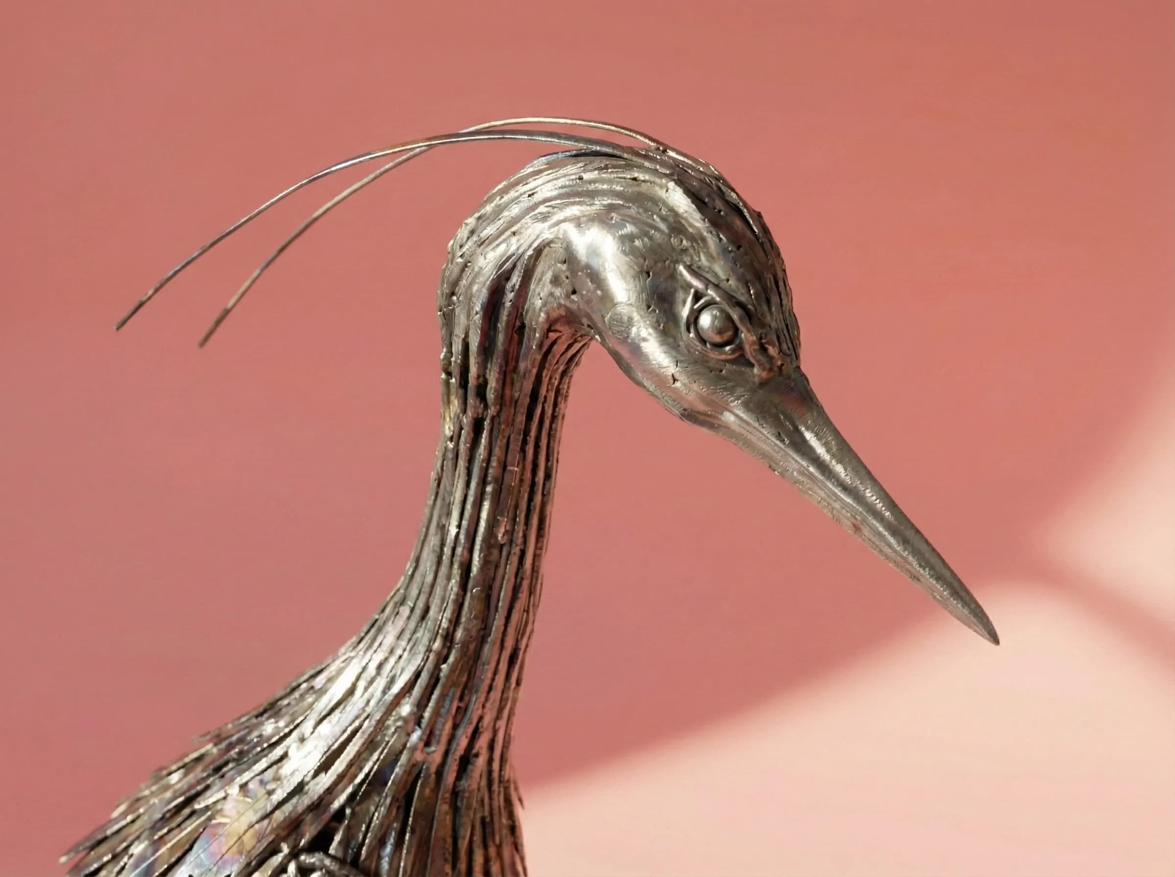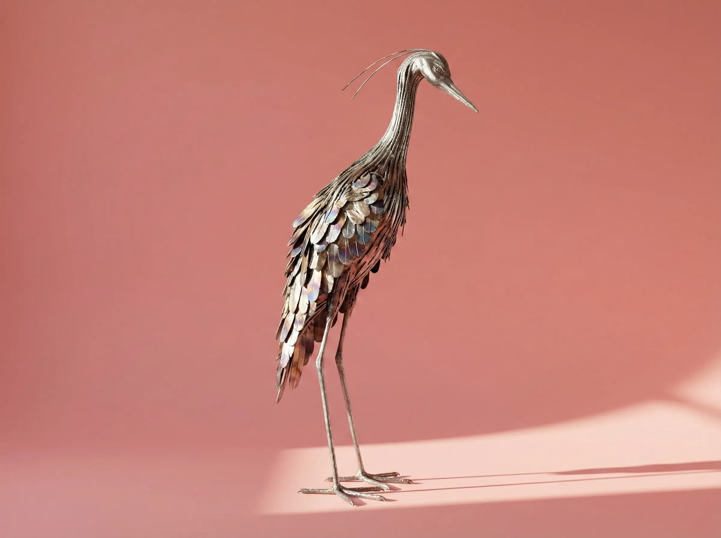 Crafted from stainless steel, this piece emphasises the contrast between the bird's sleek, serpentine neck and the dense layering of its body plumage. I utilised individual steel plates to create the shingled appearance of the wing feathers. To achieve the "blue" of the heron, the steel was selectively heat-tinted, drawing out a spectrum of iridescent purples, indigos, and warm bronzes that shimmer as the light changes. The sculpture is finished with the heron’s characteristic wispy head plumes, rendered in delicate steel wire, adding a final touch of grace to this wetland hunter.