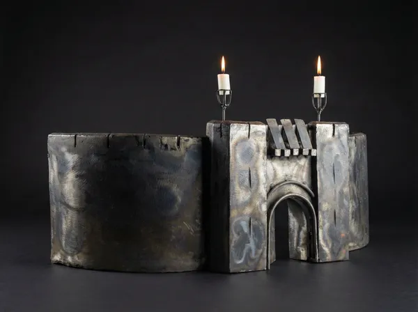 “A hand-crafted steel sculpture of Helm’s Deep from Lord of the Rings. Originally a gaming centerpiece, now a functional heat-tinted fireplace guard.”