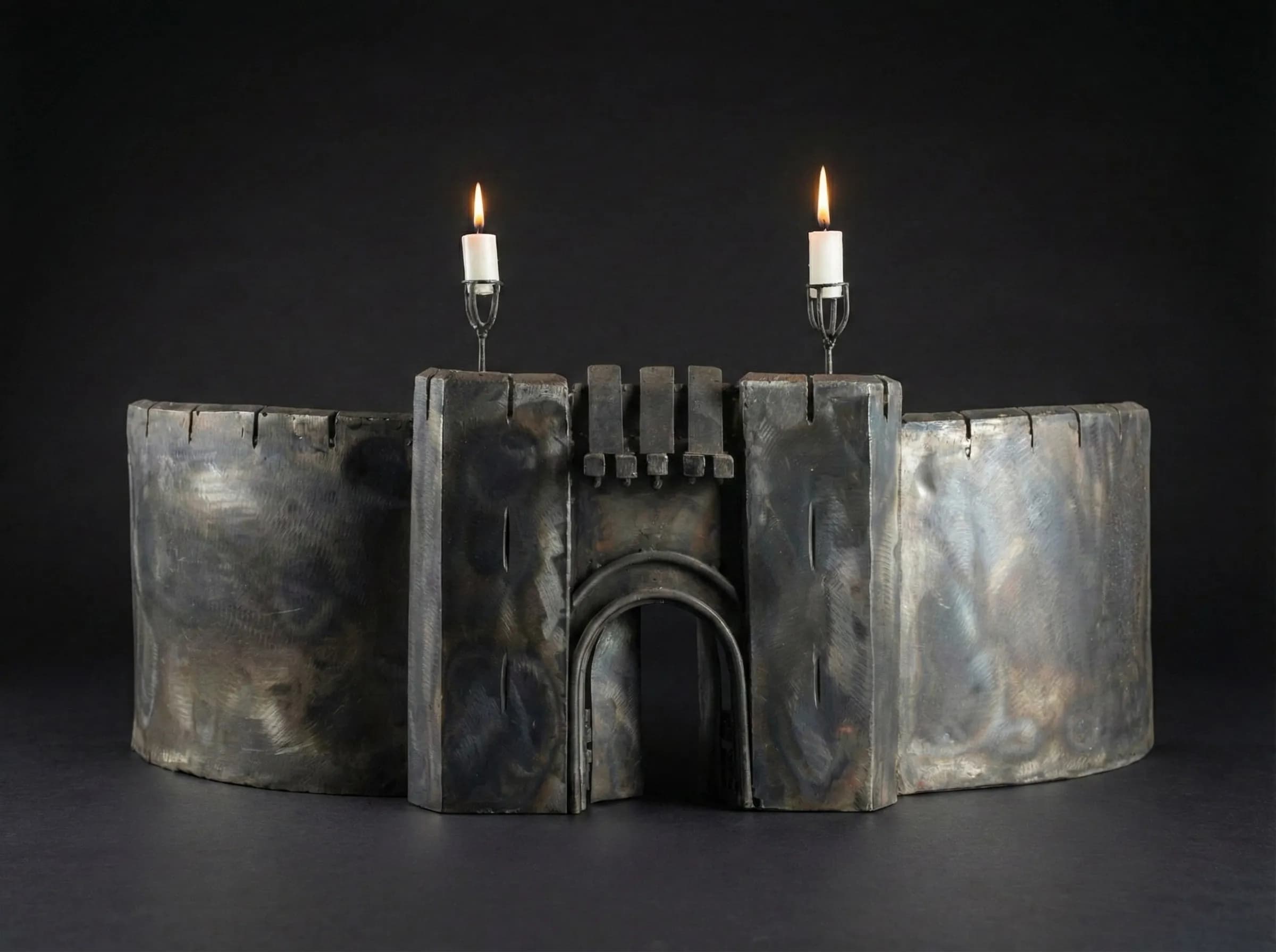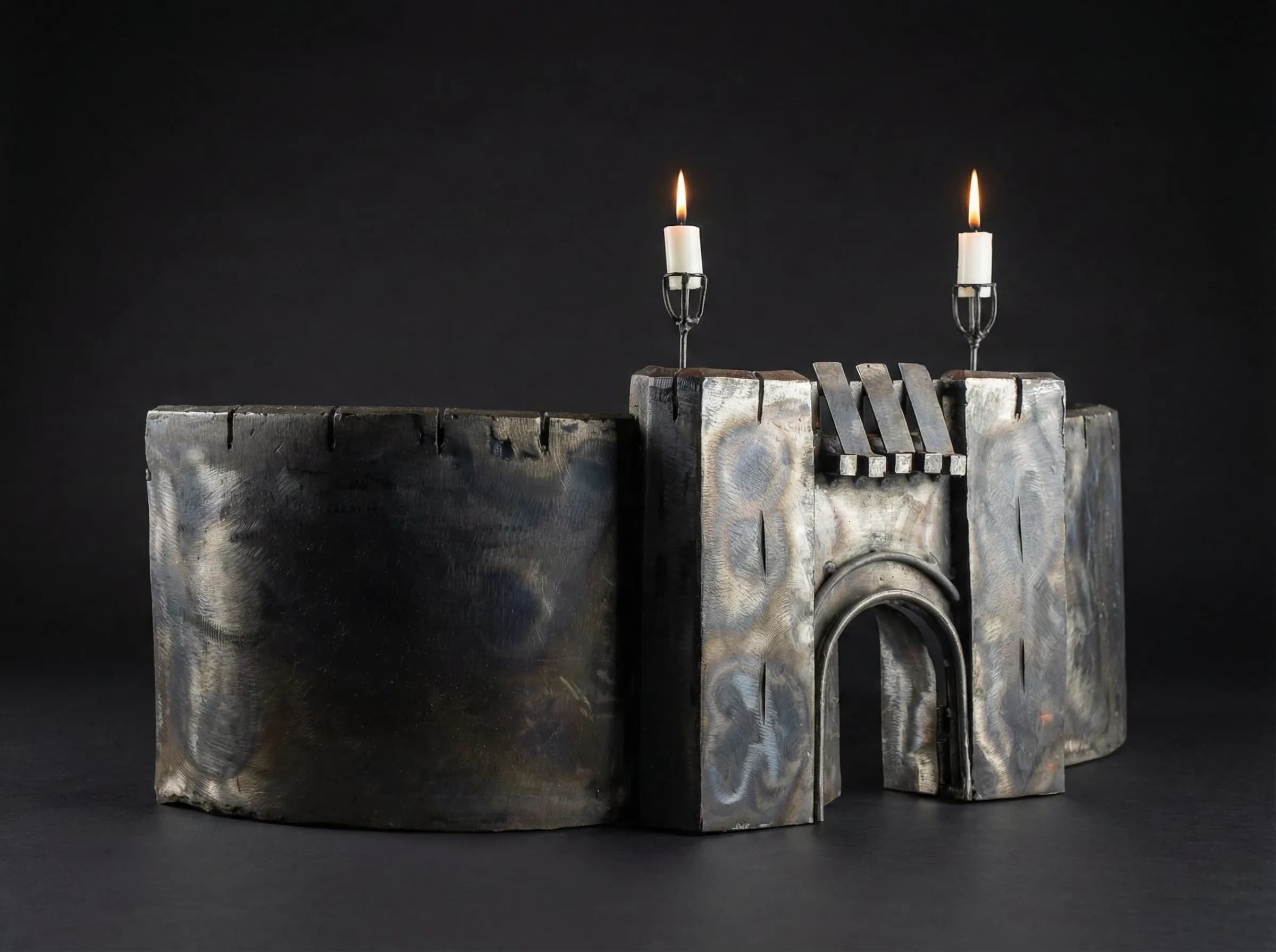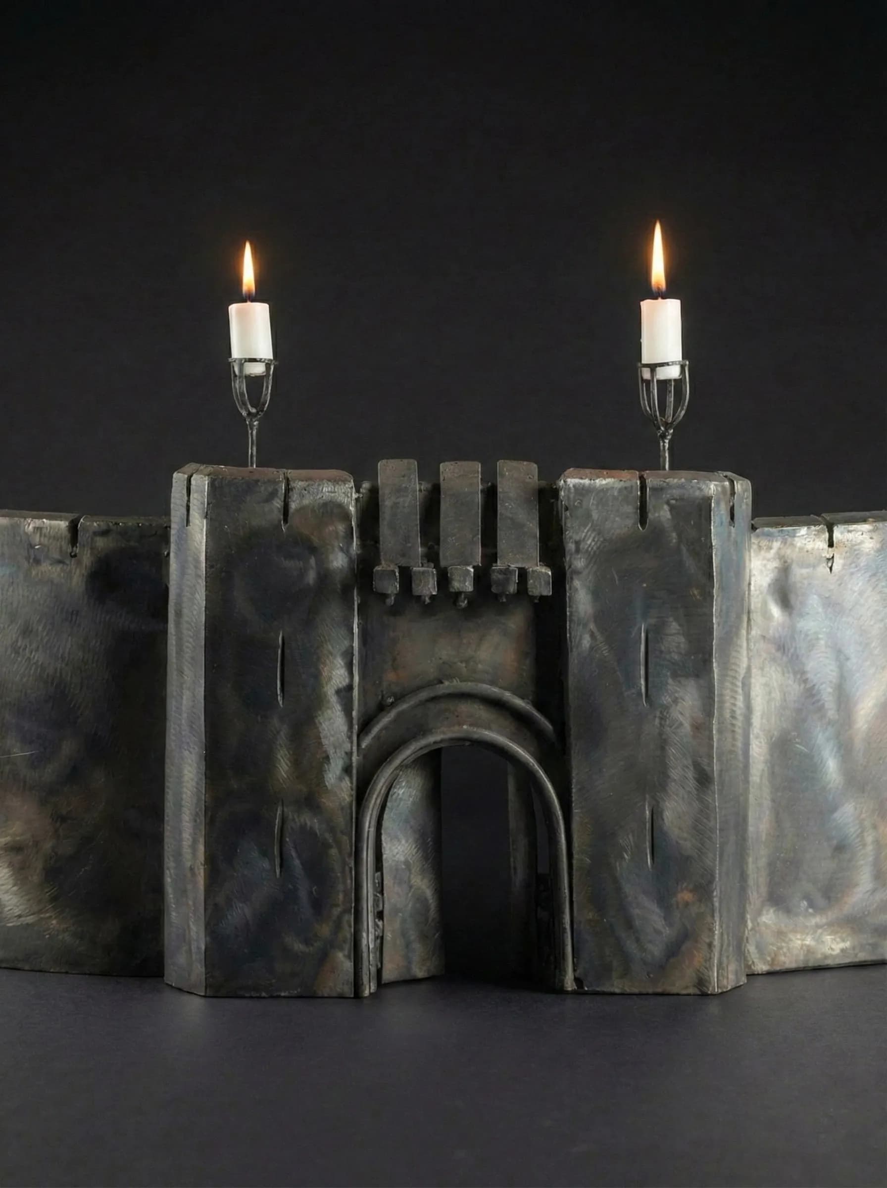 Crafted from heavy-gauge steel, the sculpture features the iconic curved Deeping Wall and the reinforced main gatehouse. To achieve the ancient, weathered appearance of mountain stone, I utilized heat-tinting techniques, allowing deep greys, charred ambers, and iridescent violets to bloom across the metal's surface. Today, the sculpture has transitioned into a functional role within our home, serving as a bespoke fireplace guard. Mounted with twin candleholders atop its towers, the flickering flames reflect off the tempered steel, bringing the legendary fortress to life in the glow of our own hearth.