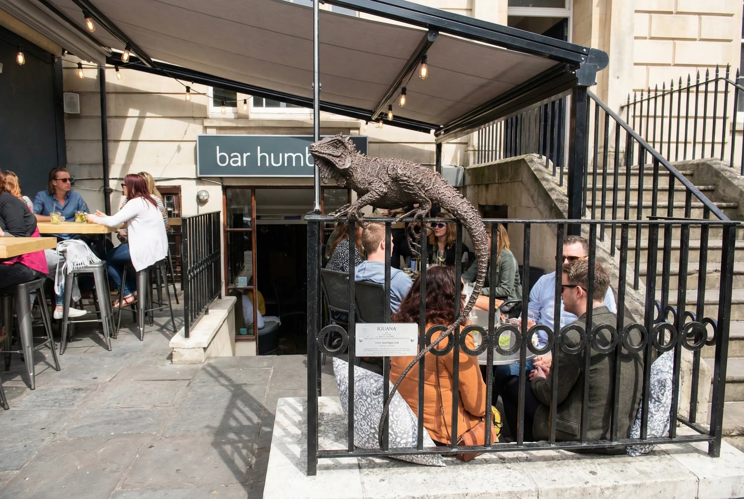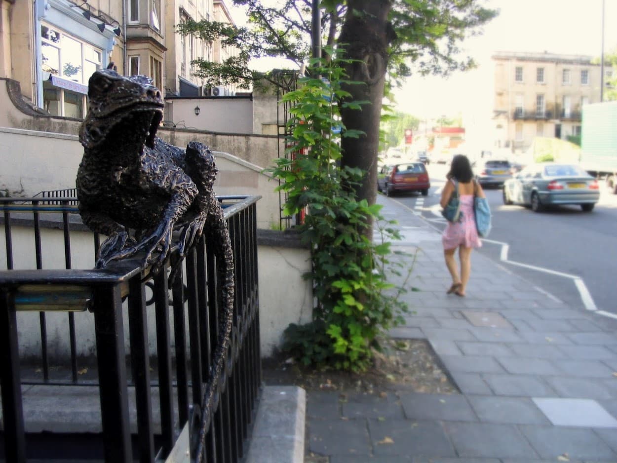 “The iconic "James" iguana sculpture on Whiteladies Road. Originally a gift to Bar Humbug, it now remains as a lucky landmark at Pazzo, Bristol.”