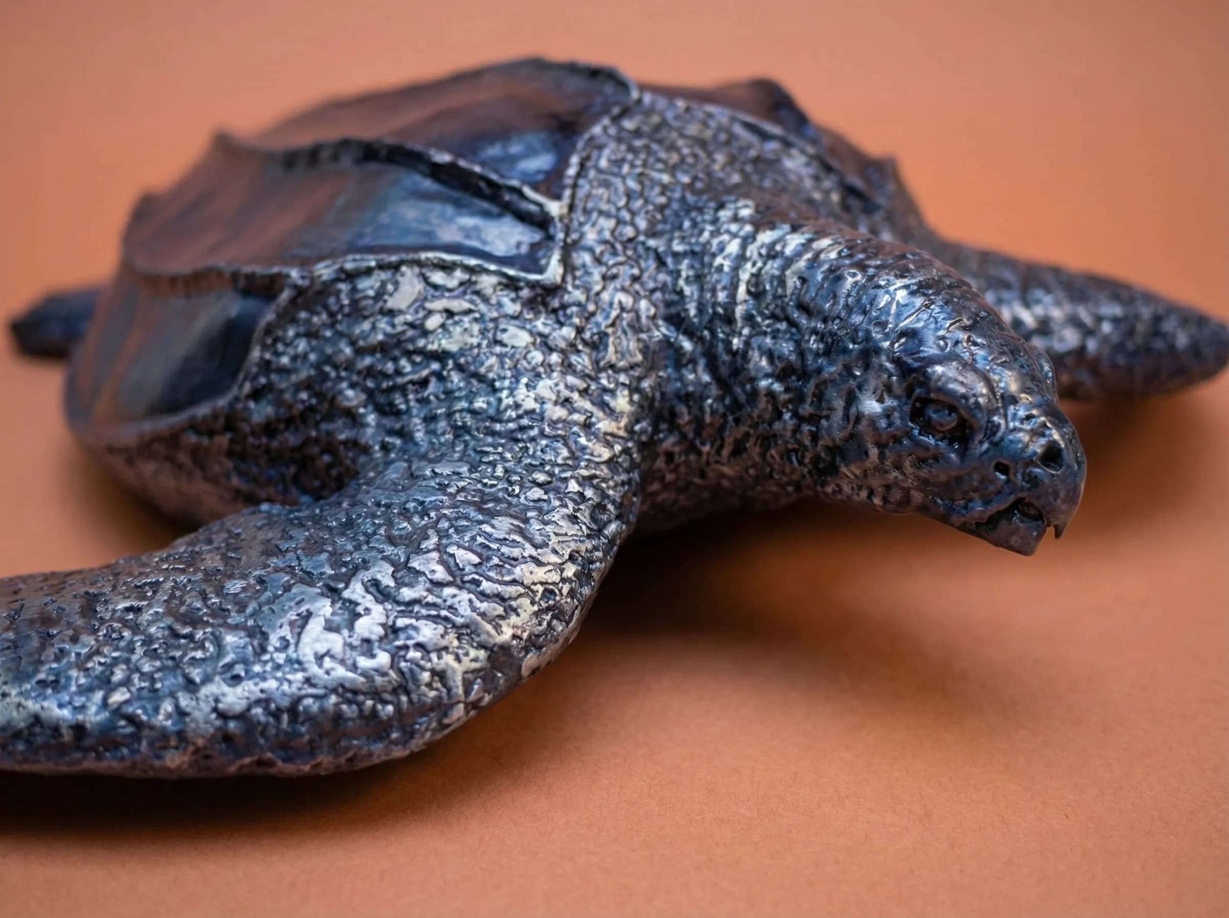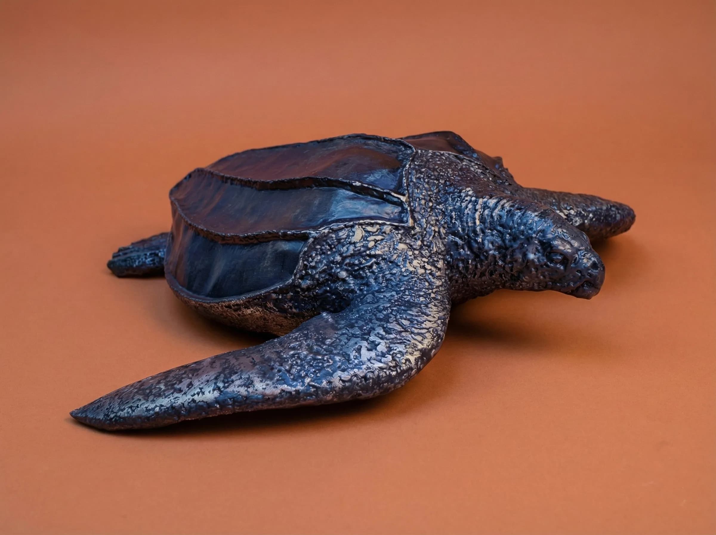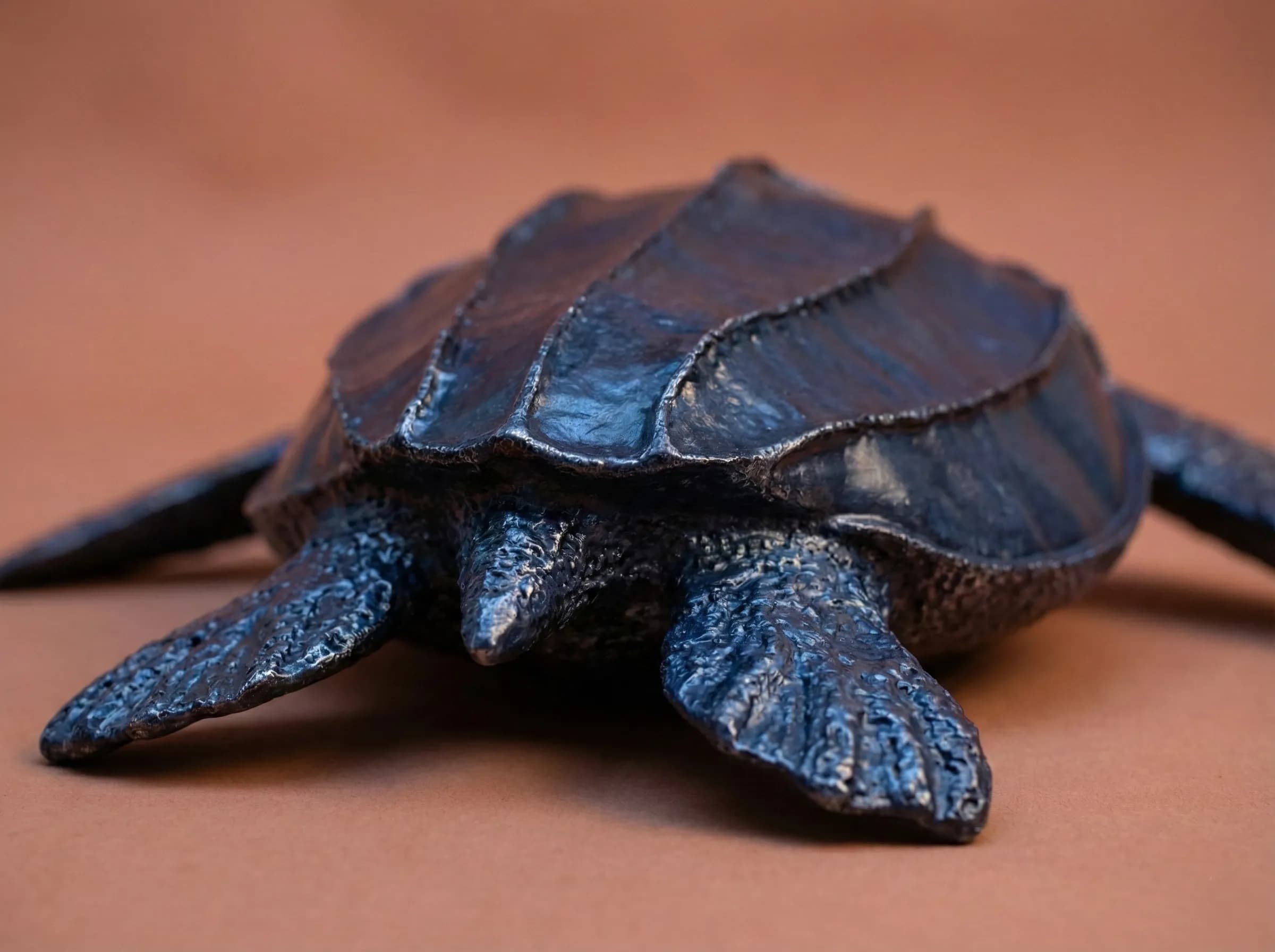 In this piece, I focused on the turtle’s signature longitudinal ridges and the rugged, tactile surface of its "leathery" carapace. To mimic the deep, mottled blues and blacks of the species, the steel was intensely heated, resulting in a permanent, iridescent patina that shifts like moonlight on wet skin.