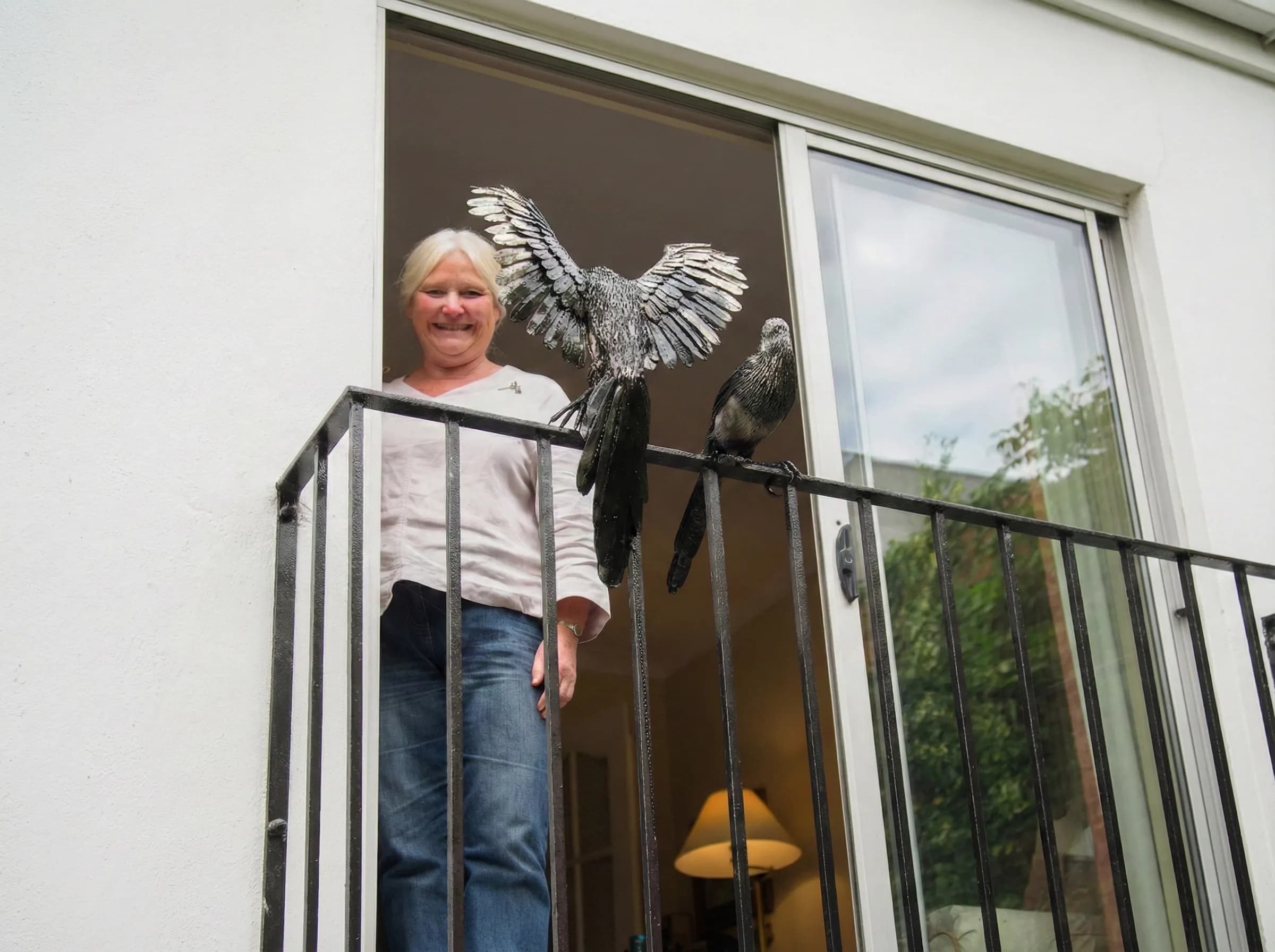 Crafted from stainless steel, the sculptures utilize the metal's reflective properties to replicate the iridescent sheen of the magpie's feathers. To achieve the deep, shimmering greens and purples found in their real-life counterparts, the steel was carefully heated, creating a permanent thermal color that shifts with the natural light of the balcony. Mounted directly onto the railing, the pair serves as a constant, spirited link between the home and the surrounding environment.