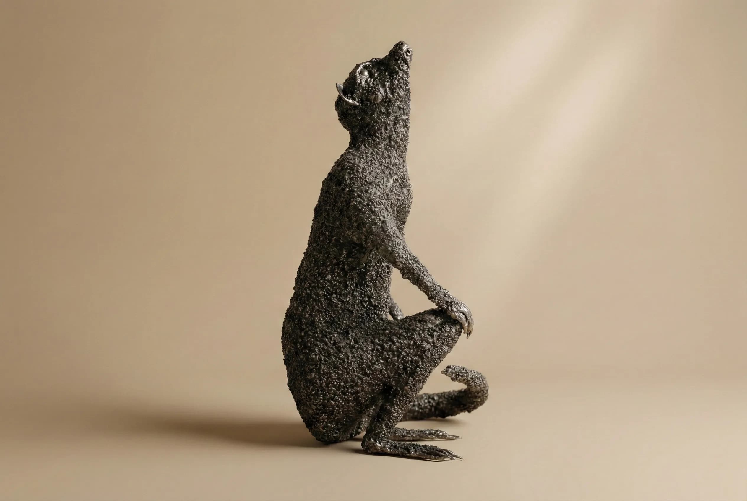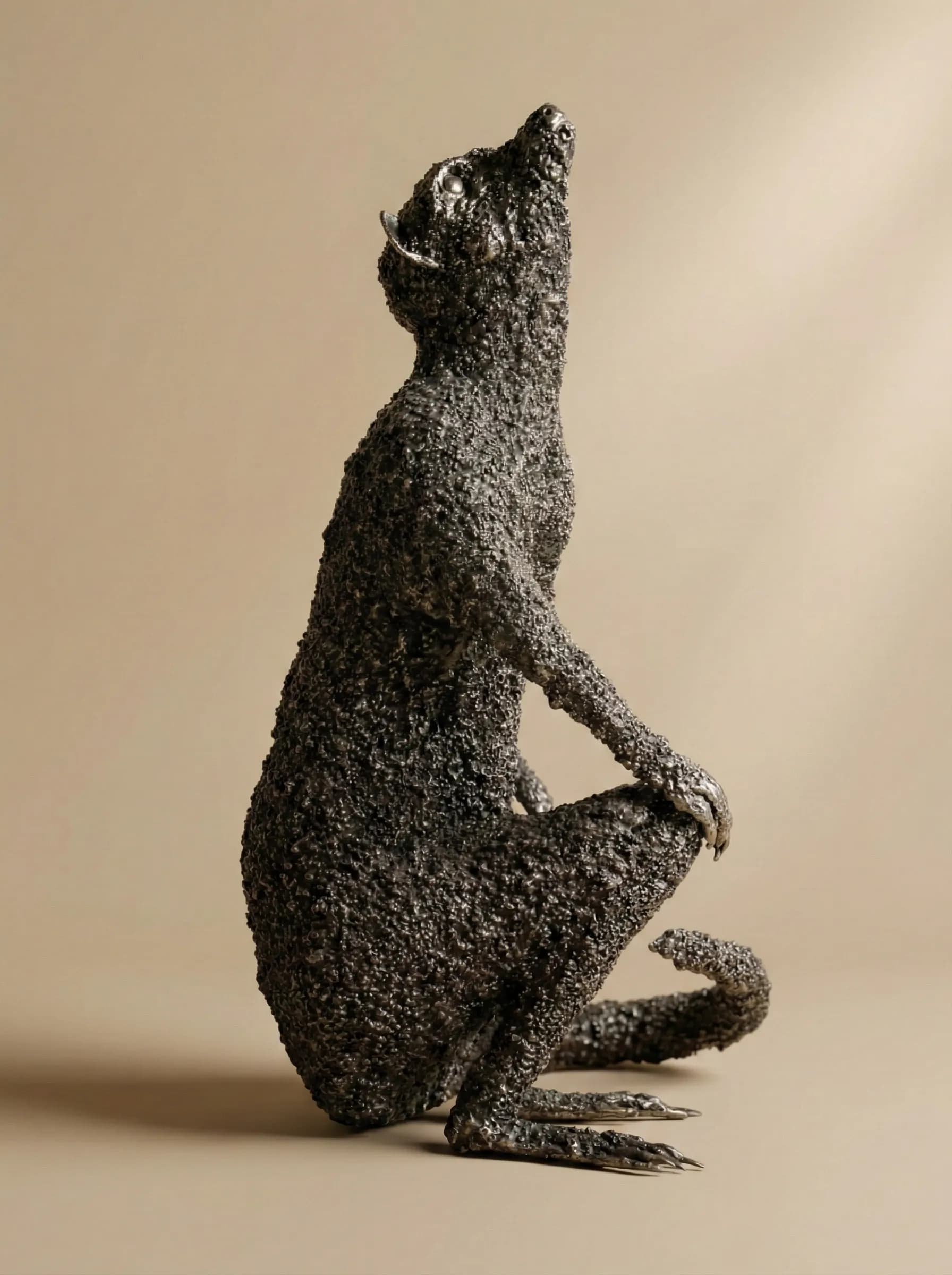 Crafted from hand-worked steel, the sculpture emphasises the animal's alert silhouette—head tilted back and eyes scanning the horizon. The dark, weathered patina of the metal adds a sense of ancient resilience to the form. Though it was created early in my practice, the piece remains a permanent fixture in my own home, serving as both a personal landmark and a reminder of the inquisitive, social spirit that first drew me to sculpting the natural world.