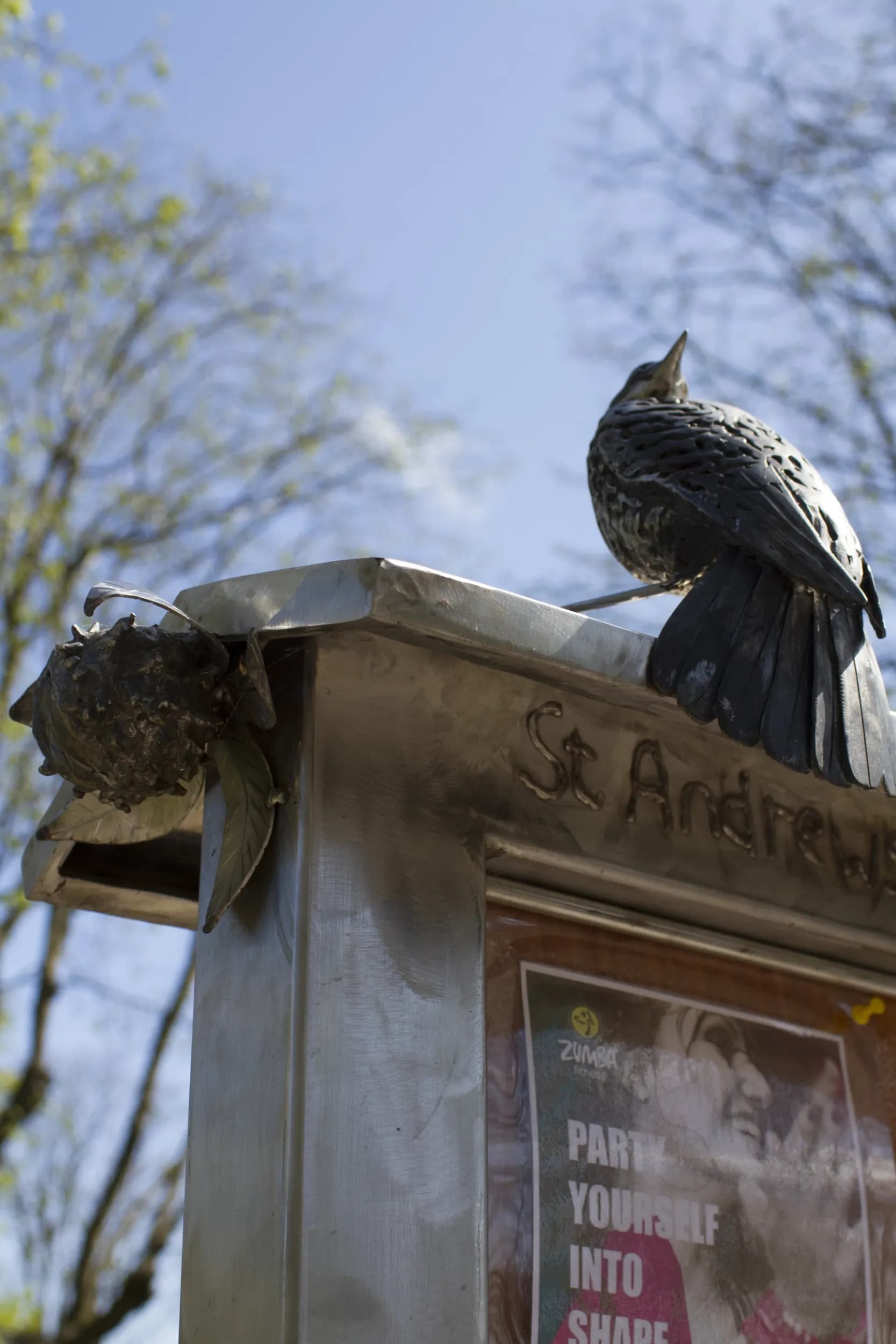 “A custom stainless steel community noticeboard created for St Andrews Park, Bristol. Features integrated wildlife sculptures including a blackbird and local flora.”