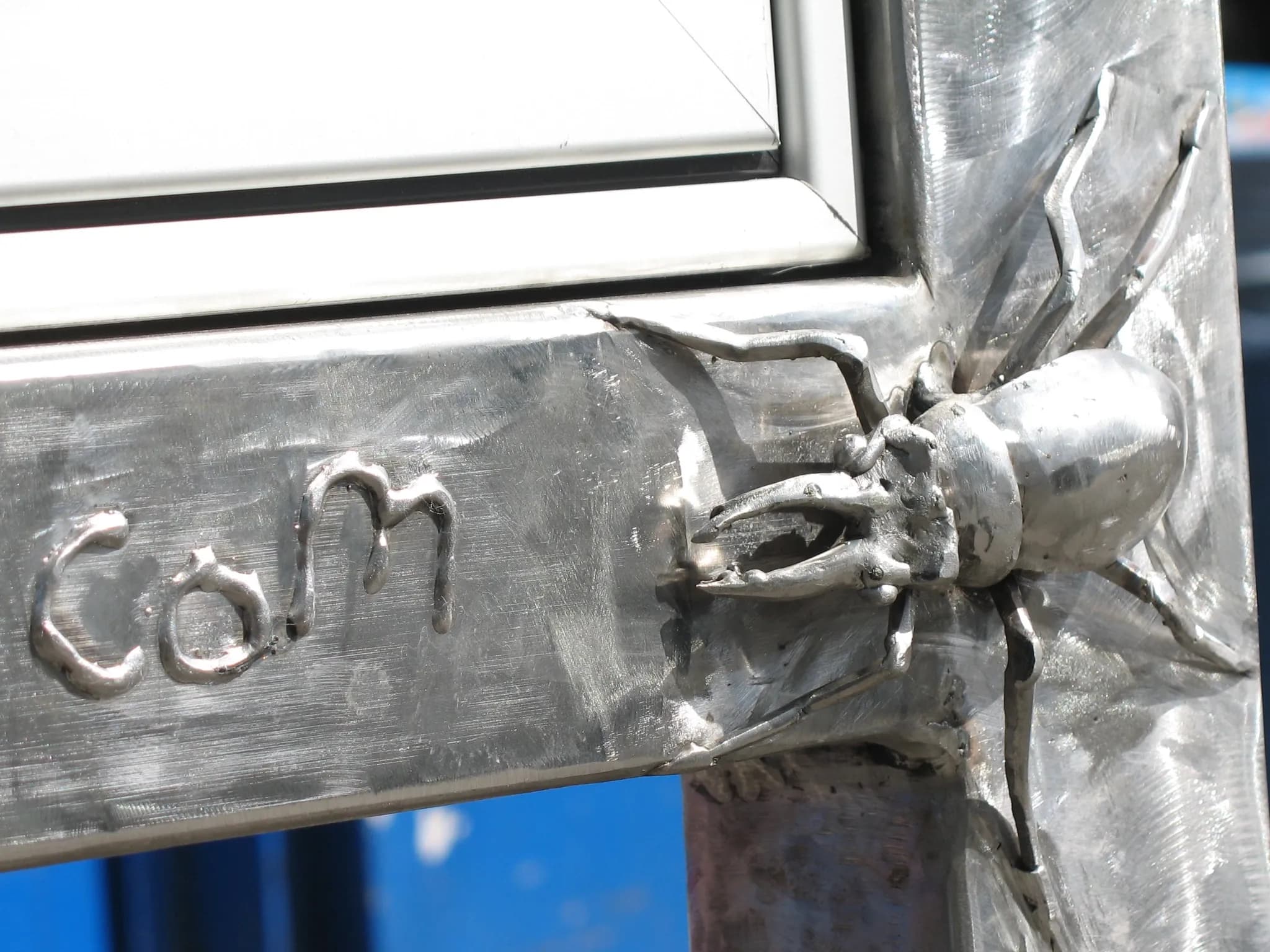 The structure is crafted entirely from highly durable, low-maintenance stainless steel, ideal for busy high-street environments. The vertical pillars cleverly incorporate the words "Sustainable Bishopston" cut directly into the metal. Surmounting the board is a stylised metalwork crest depicting a sun rising over a cityscape and a bicycle, celebrating eco-friendly urban living. A closer look rewards pedestrians with hidden wildlife details, including a meticulously sculpted stag beetle clinging to the frame, linking the urban environment back to the natural world.