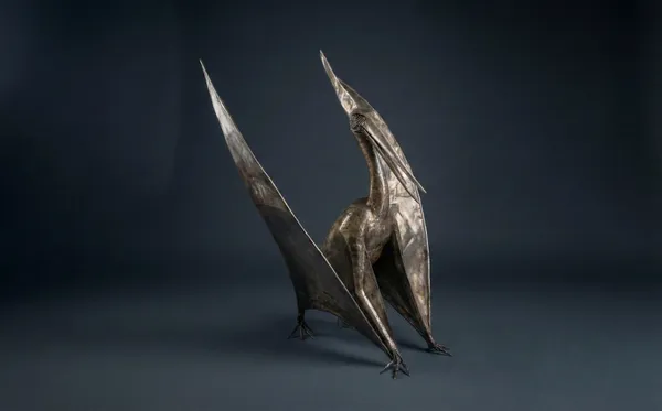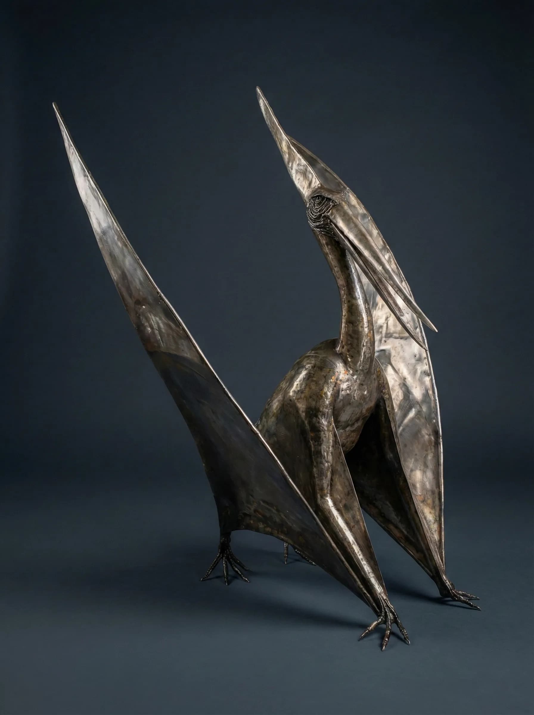 “A bespoke stainless steel Pteranodon sculpture. This life-sized piece captures the majestic crest and soaring wingspan of the prehistoric predator.”