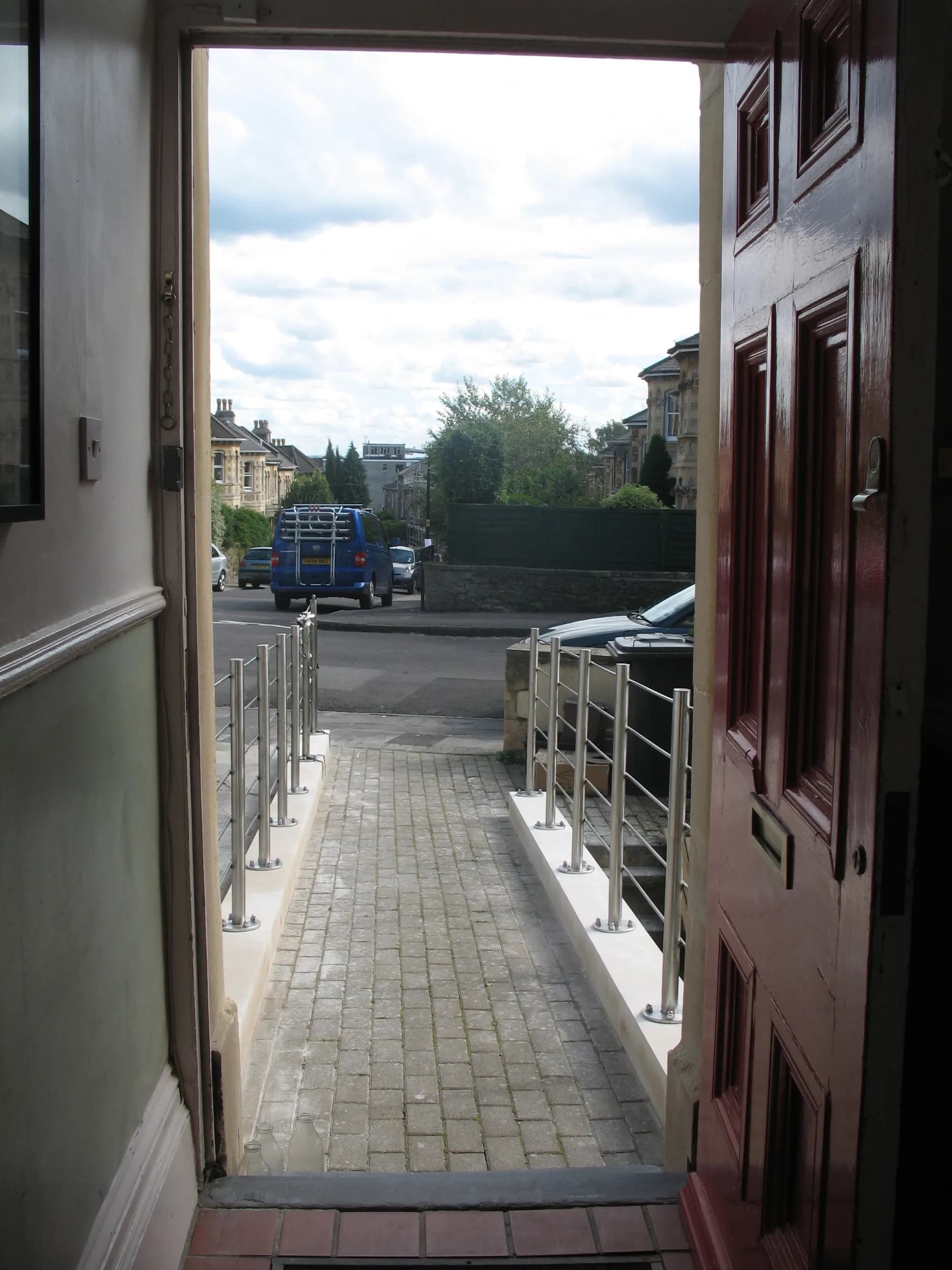 Commissioned for a residential property at 84 Worrall Road in Clifton, Bristol, this pair of bespoke stainless steel railings elegantly guides visitors up the pathway to the front door. Mounted securely into smooth Portland stone bases, the structure offers a clean, contemporary aesthetic that perfectly complements the surrounding stonework and traditional architecture of the home.