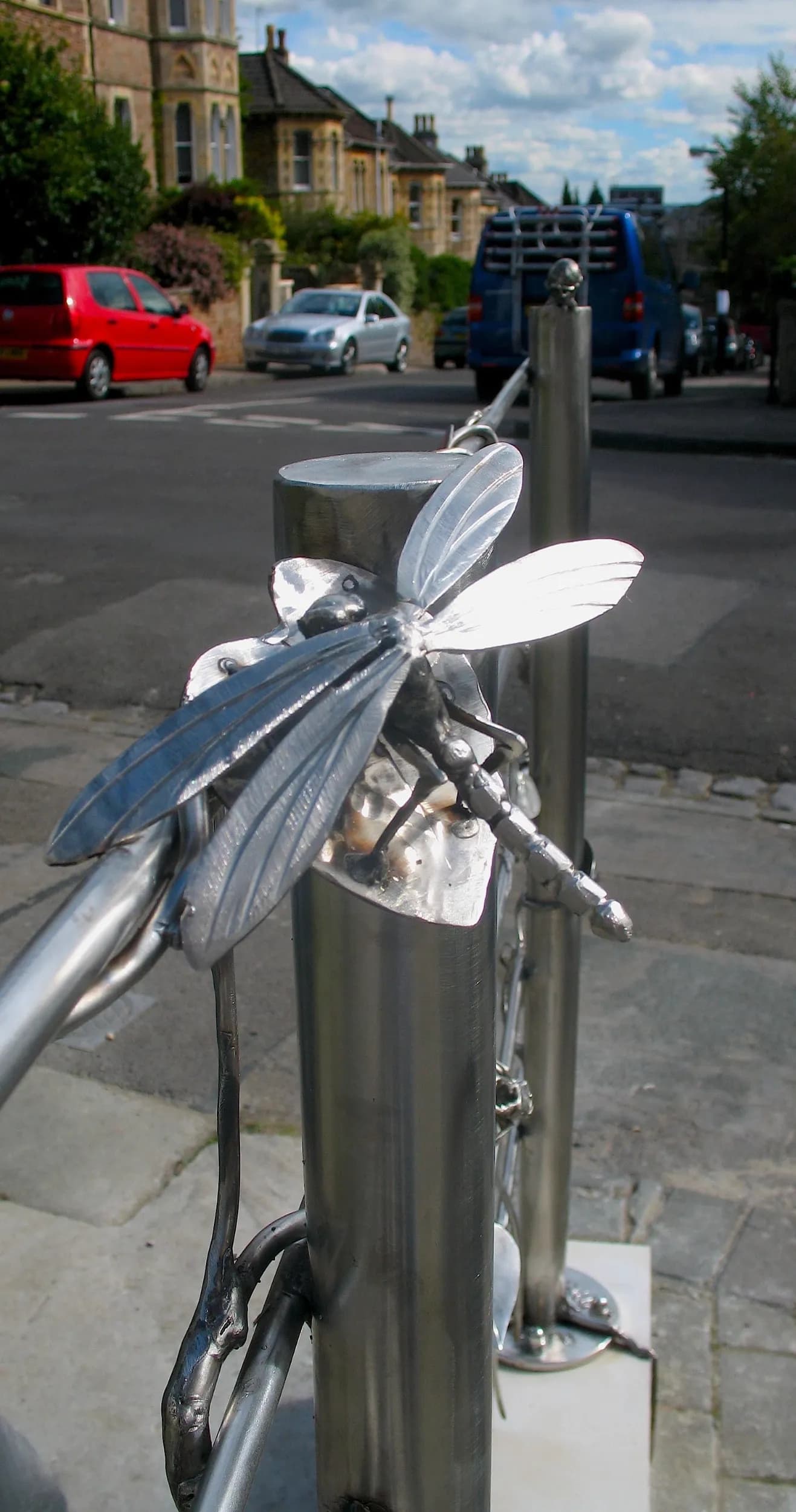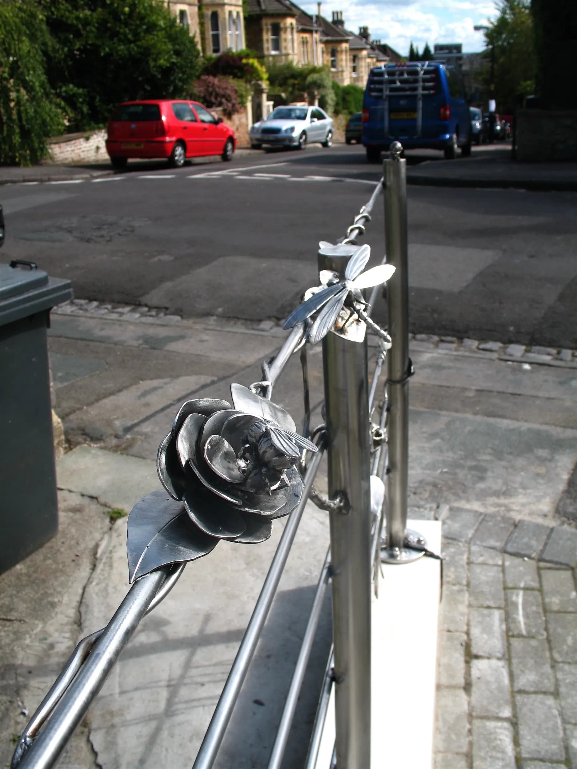 “Custom stainless steel boundary railings in Clifton, Bristol. A maintenance-free, cost-effective alternative to wrought iron, featuring intricate hidden wildlife sculptures like snails, bees, and dragonflies.”