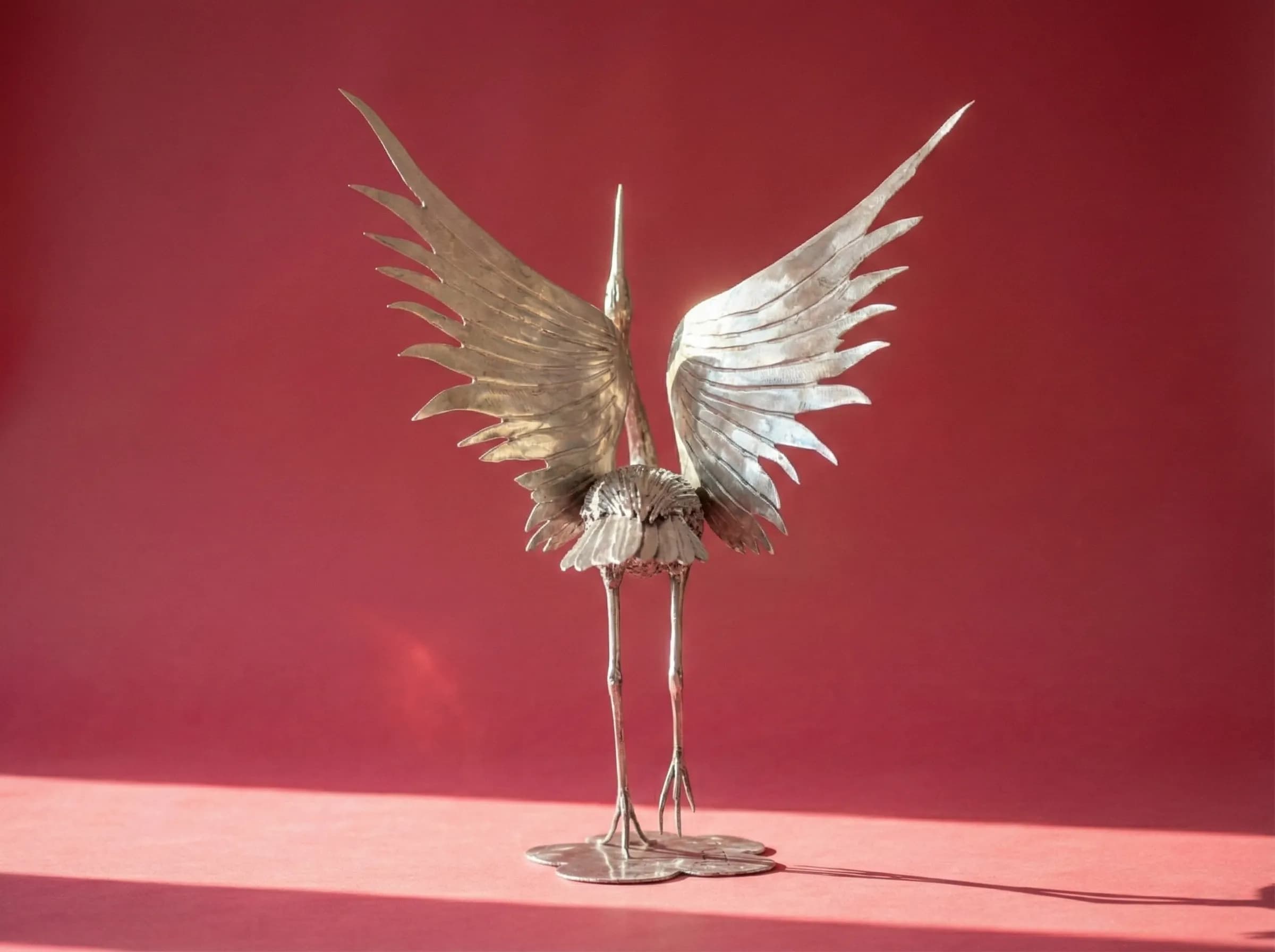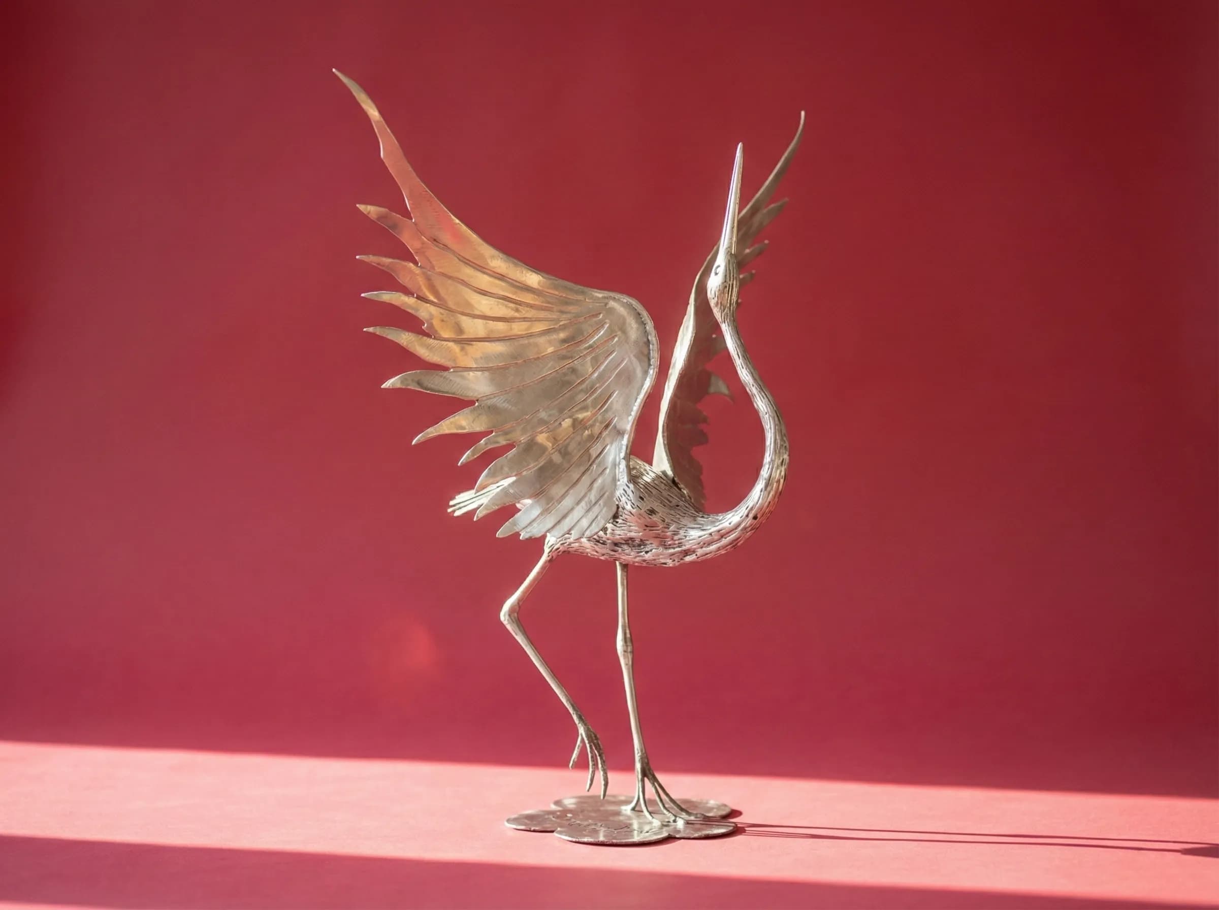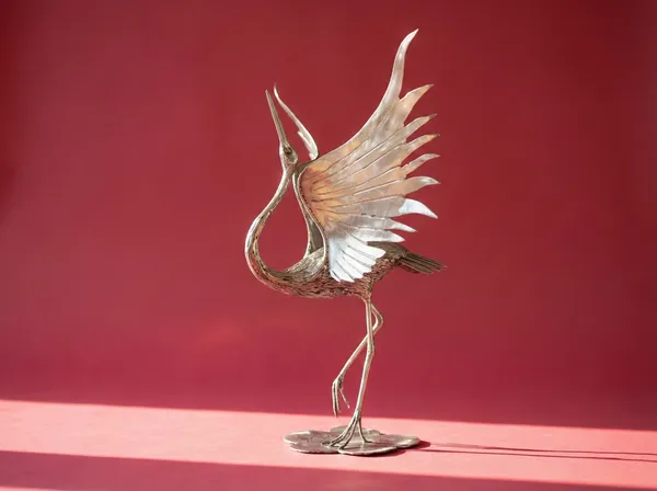 Stainless steel sculpture of a Japanese Red-Crowned Crane in mid-dance. Features contrasting polished wings and a textured, bead-welded body.