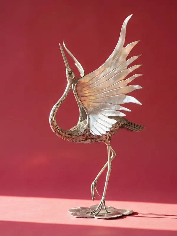 “A stainless steel sculpture of the Superb Bird of Paradise in full courtship display. Features heat-tinted iridescence and layered steel plumage.”