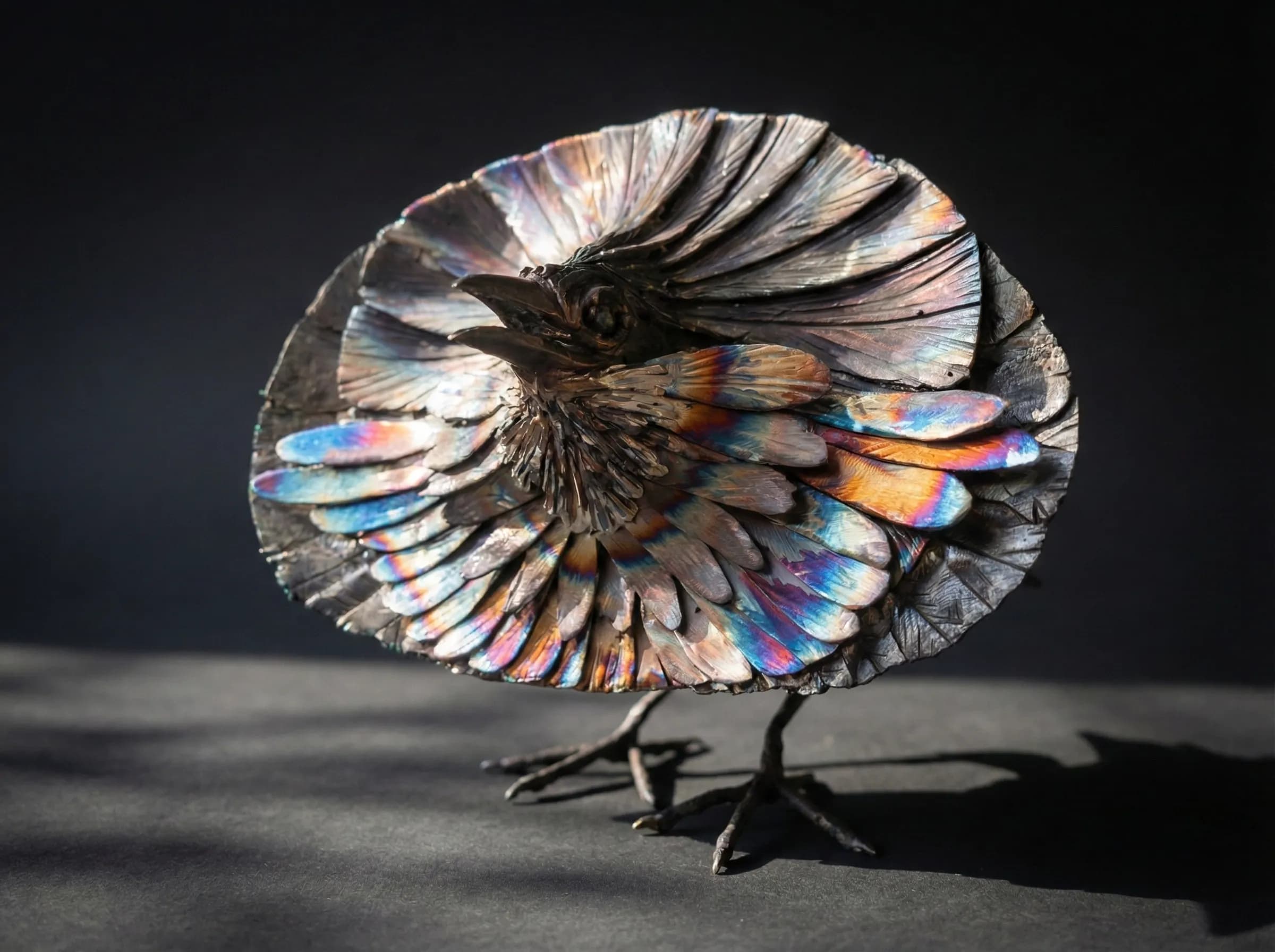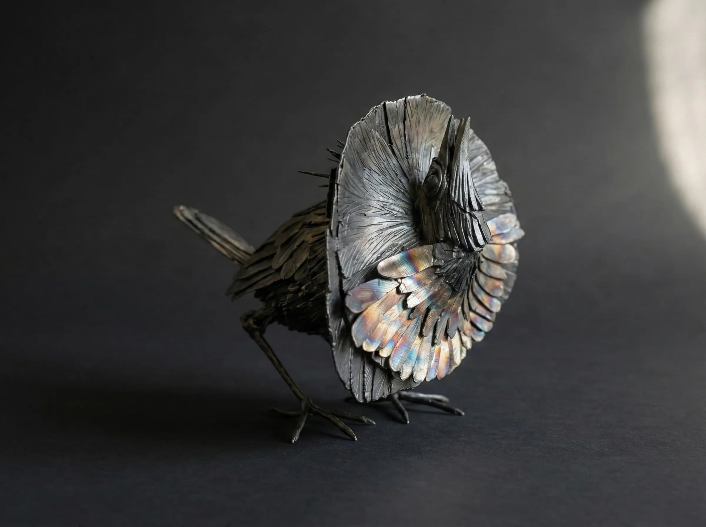 Crafted from stainless steel, the piece uses a combination of layering and heat-tinting to achieve its dramatic effect. The "fan" of the cape is constructed from overlapping steel plates, meticulously shaped to mimic the density of the bird's velvety plumage. To replicate the iridescent blue-green breast shield that defines the species, I applied localised heat to specific sections of the steel. This drew out vibrant flashes of blue, purple, and gold that contrast sharply against the darker, charred finish of the surrounding feathers. The result is a sculpture that, much like the bird itself, reveals its true brilliance only when the light hits it just right.