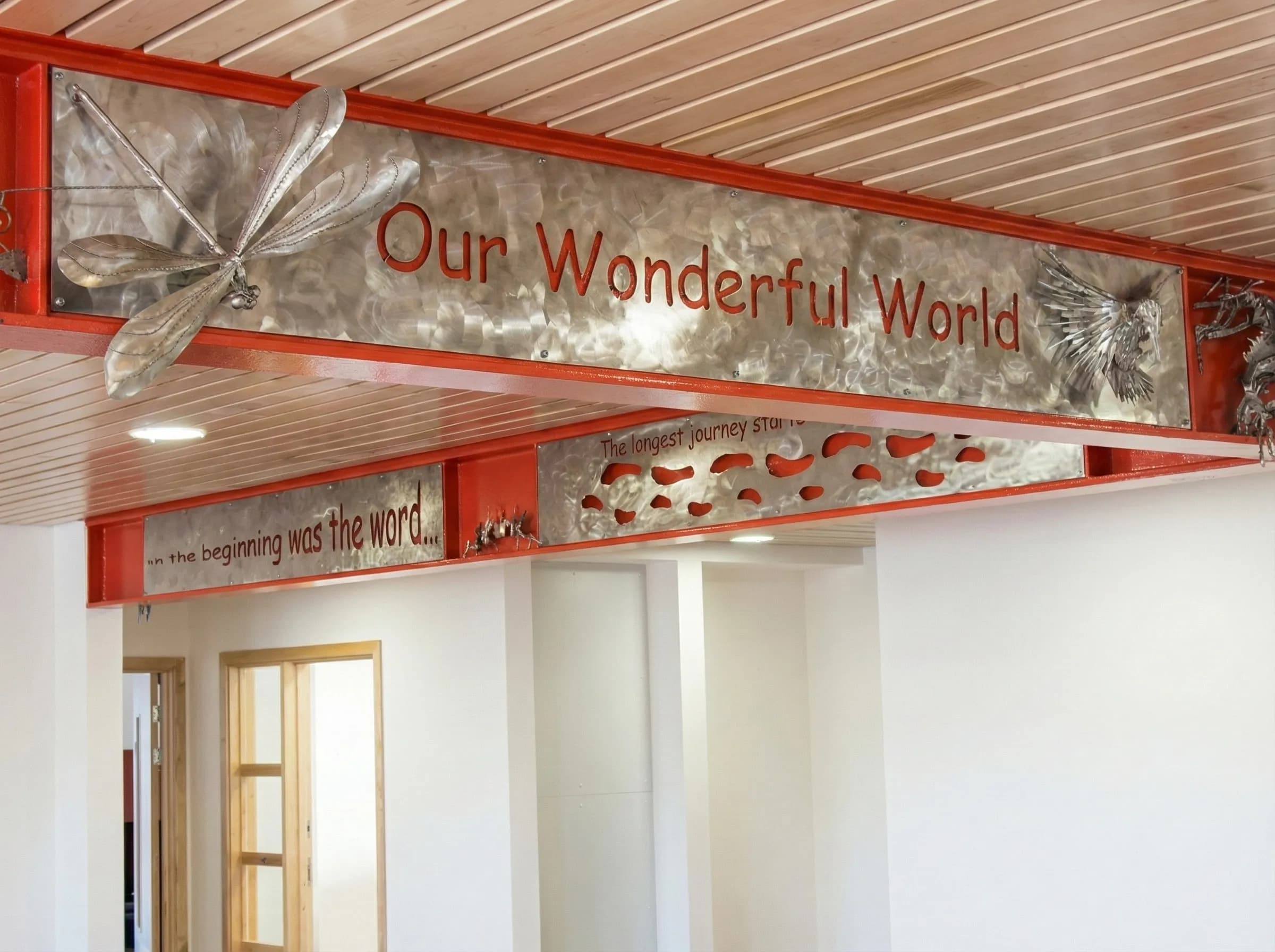 “A sprawling architectural sculpture installed in the library of King's Forest Primary School. Features burnished steel panels, inspirational quotes, and 3D wildlife sculptures.”