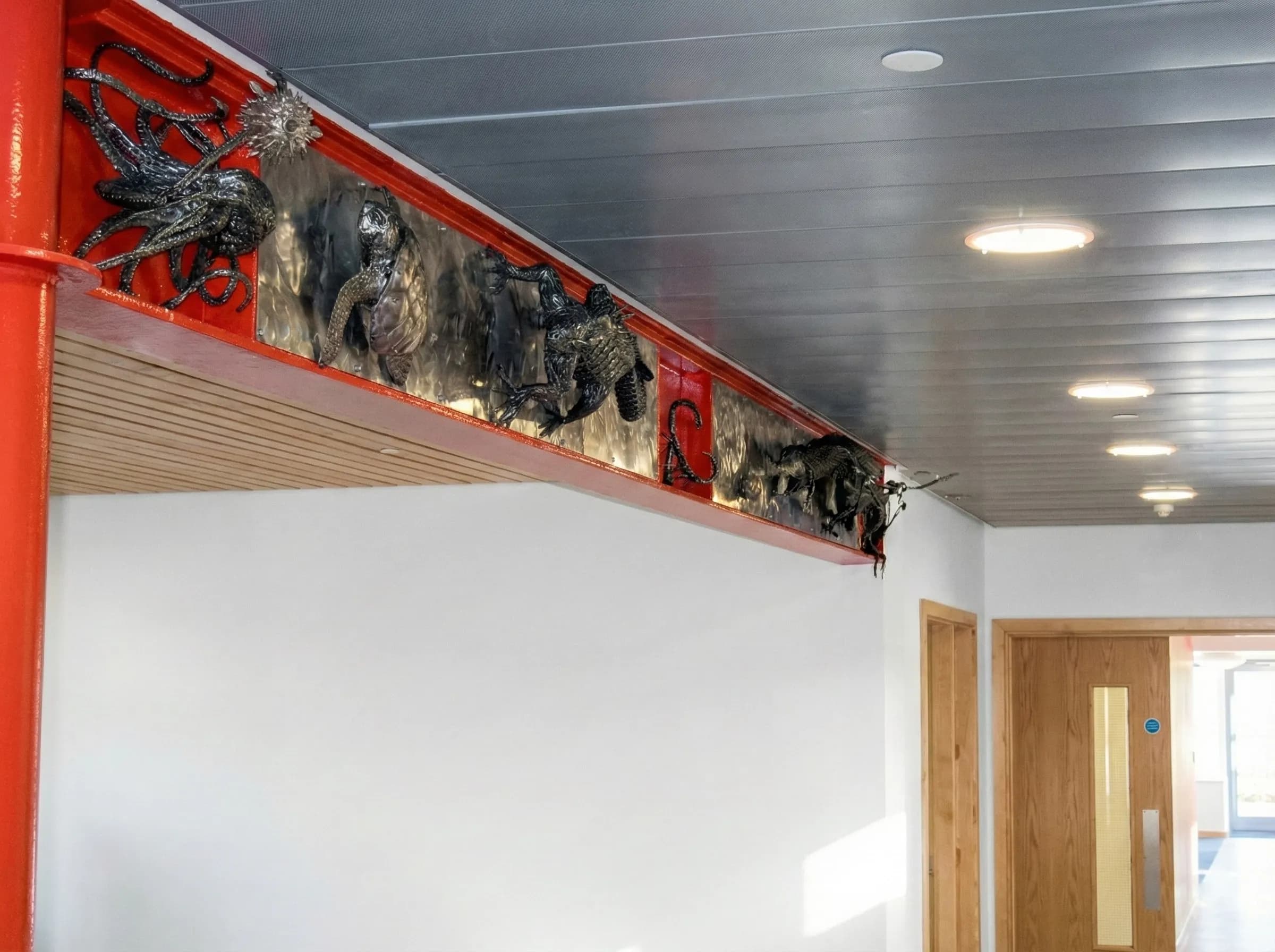 The Coasts & Oceans: A heavily textured marine iguana crawls along the upper beams, sharing the space with a swimming sea turtle and an intricate octopus.