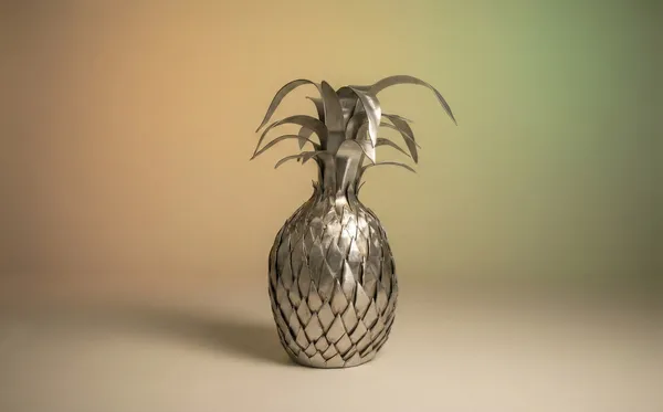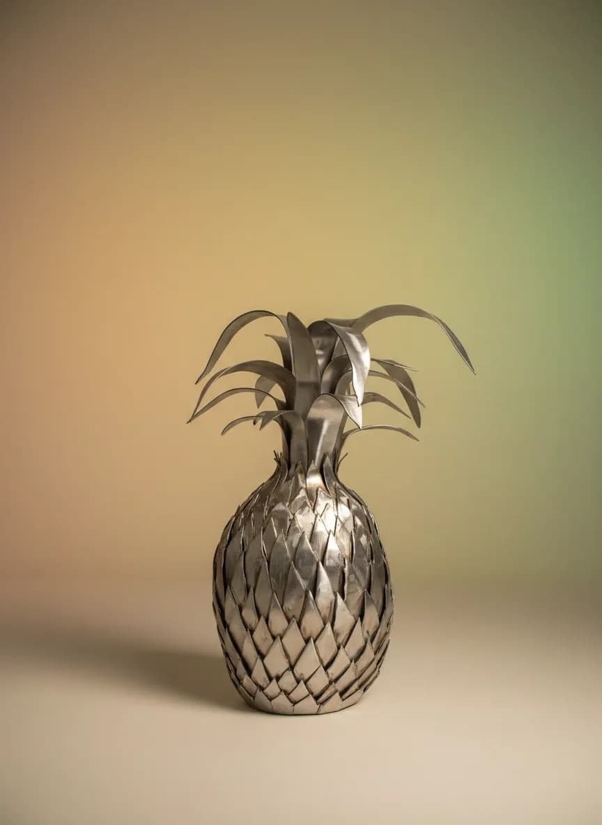 “A life-sized stainless steel pineapple sculpture created as a private commission for a home entrance. A shimmering symbol of hospitality and welcome.”