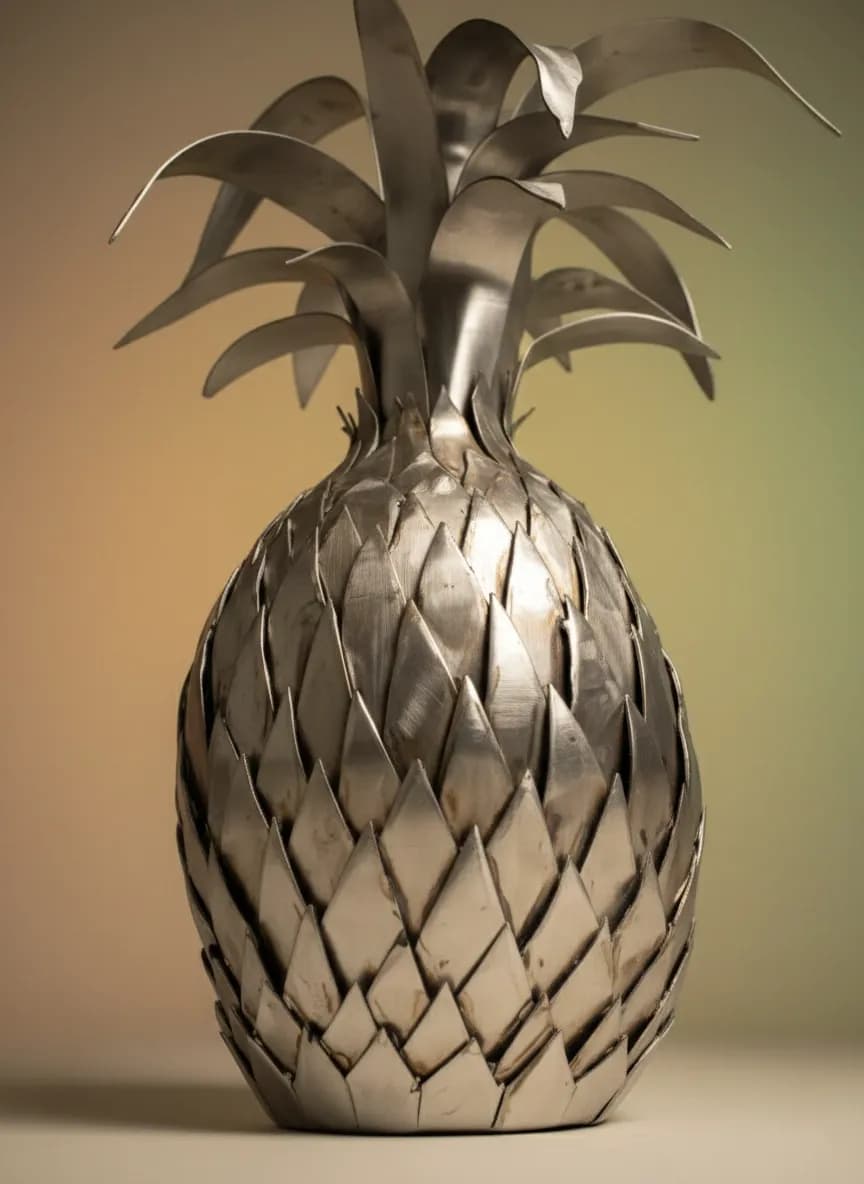 In this piece, I utilized stainless steel to capture the intricate, repeating geometry of the fruit’s exterior. Each individual "scale" was meticulously shaped and layered to create a rich, tactile surface that catches the light from every angle. The sculpture is crowned with a spray of sharp, elegant leaves, mirroring the plant’s distinctive architectural form.