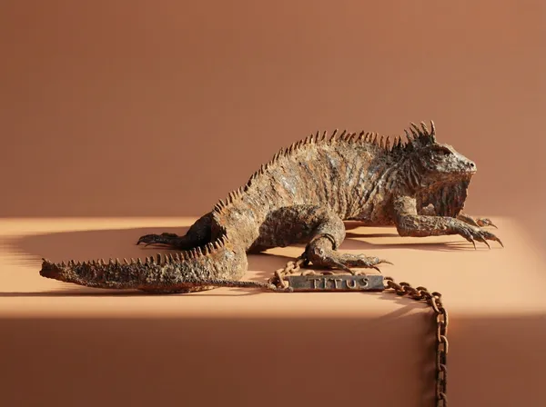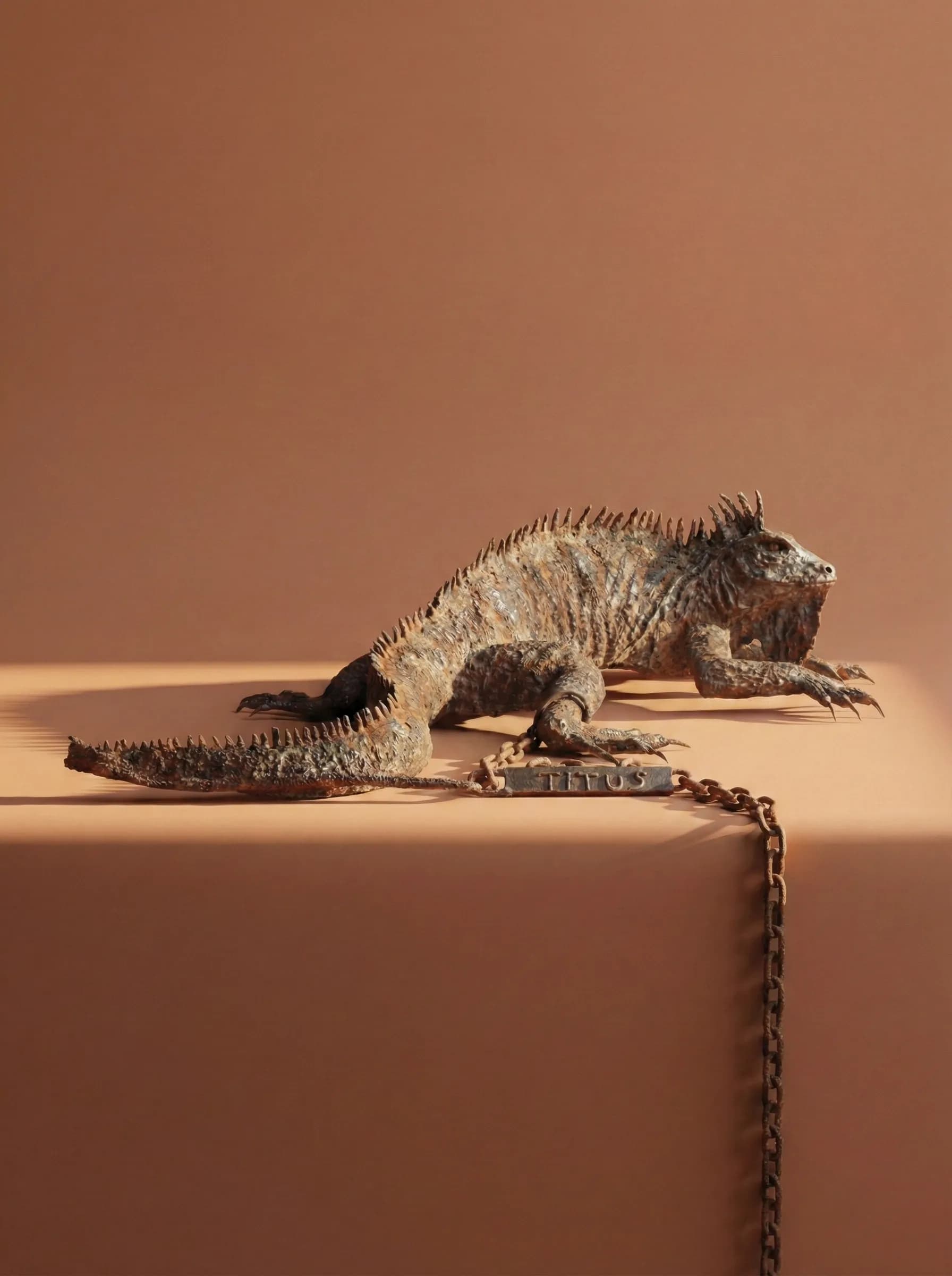 Distinct from my polished stainless steel works, Titus features a heavily textured, oxidized finish. I achieved this rugged, "armored" surface by building up layers of weld to mimic the rough, salt-encrusted skin of an iguana that spends its life between cold ocean waters and hot volcanic rock. The sculpture is grounded by a heavy steel chain and a welded nametag, adding a layer of narrative intrigue—suggesting a story of captivity, companionship, or perhaps a nod to the Victorian era of collecting exotic specimens.